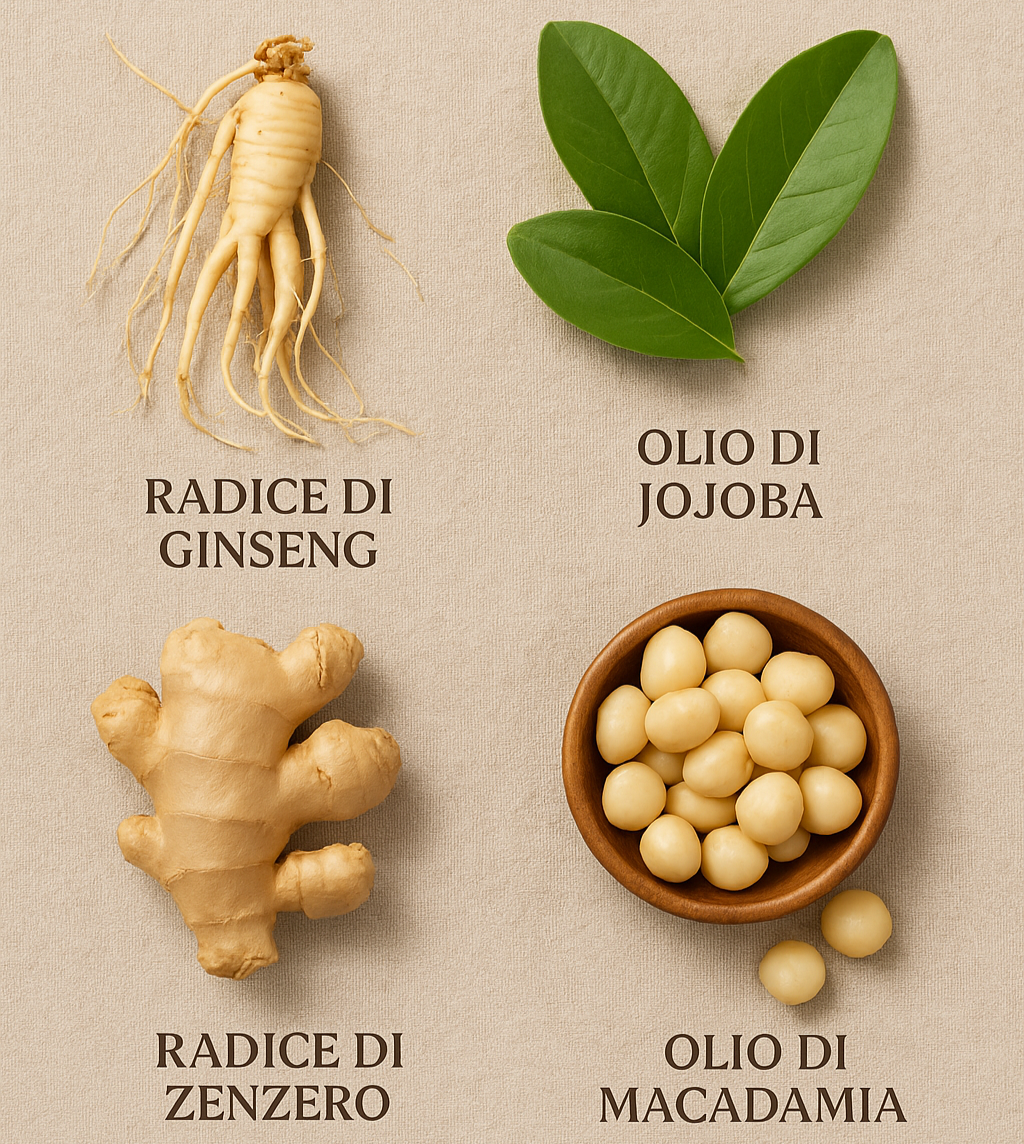 Ingredienti: Acqua, alcool cetearilico, ceteareth-25, p-fenilendiammina, glicole propilenico, acido ascorbico (vitamina C), gliceril stearato, squalano, petrolato, ciclopentasilossano, profumo, resorcinolo, solfito di sodio, fenilmetilpirazolone, cloruro di cetrimonio, olio di semi di macadamia ternifolia, olio di semi di simmondsia chinensis (jojoba), EDTA tetrasodico, etanolo. Altri oligoingredienti: estratto di radice di Polygonum multiflorum, estratto di radice di Zingiber officinale (zenzero), estratto di radice di Panax ginseng, m-aminofenolo, N,N-bis(2-idrossietil)-p-fenilendiammina solfato, 1,2-esandiolo, fenossietanolo, etilesilglicerina.
